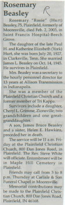 | Other | A son, James Bruce Beasley, and a sister, Helen E. Hawkins, preceded her in death. |