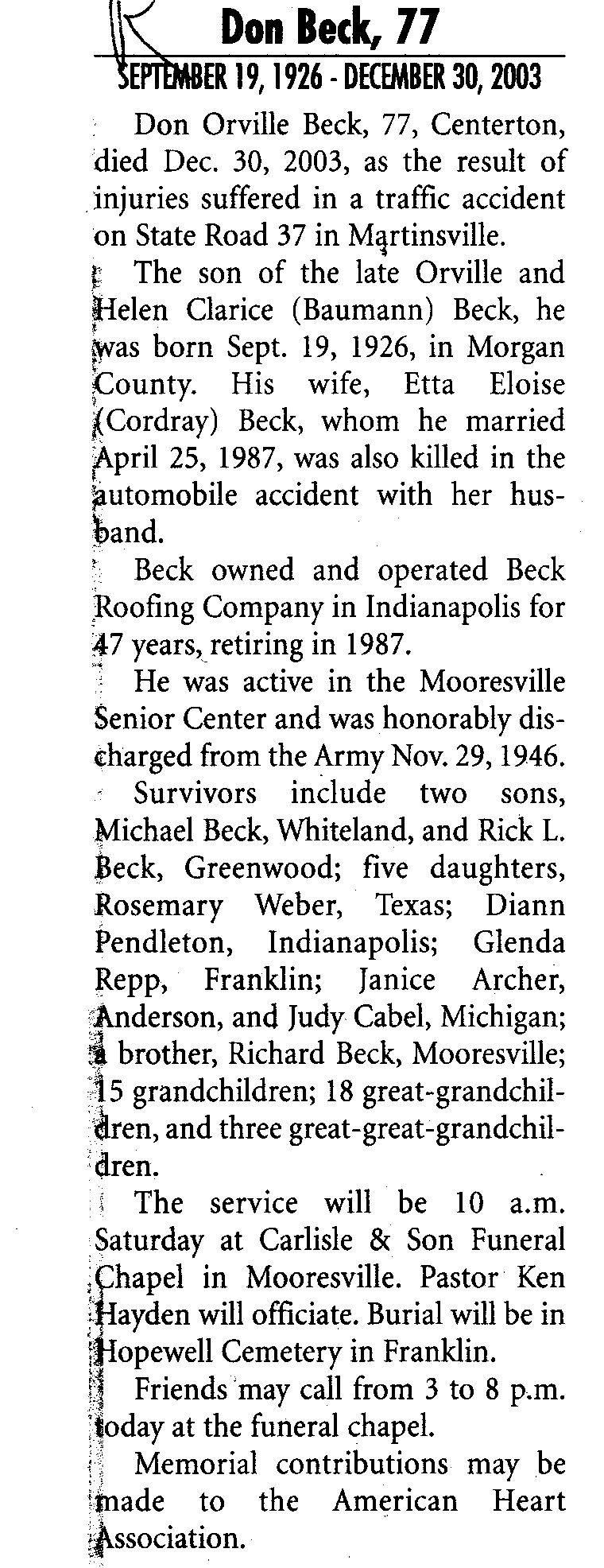 | Survived By | Two sons, Michael and Rick L. Beck; 5 daughters, Rosemary Weber, Diann Pendleton, Glenda Repp, Janice Archer, and Judy Cabel; one brother, Richard Beck; 15 grandchildren; 18 great-grandchildren; 3 great-great-grandchildren. |
