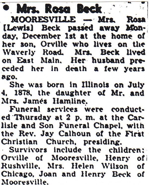 | Obituary Source | Mooresville Times, Dec. 4, 1952 |