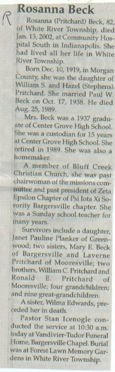 | Survived By | Daughter, Janet Pauline Planker; 2 sisters, Mary E. Beck and Laverne Pritchard; 2 brothers, William C. and Ronald E. Pritchard; 4 grandchildren; 9 great-grandchildren. |