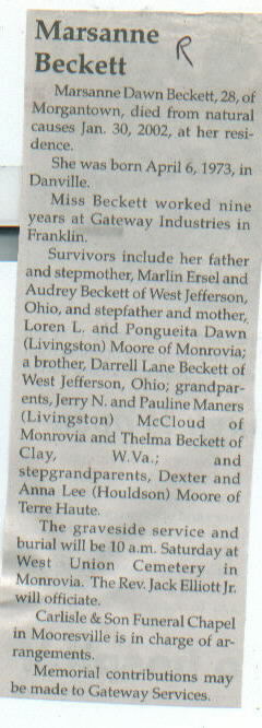 | Survived By | Father and stepmother, Marlin Ersel and Audrey Beckett; stepfather and mother, Loren L. and Pongueita Dawn (Livingston) Moore; brother, Darrell Lane Beckett; grandparents, Jerry N. and Pauline Maners (Livingston) McCloud and Thelma Beckett; stepgrandparents. |