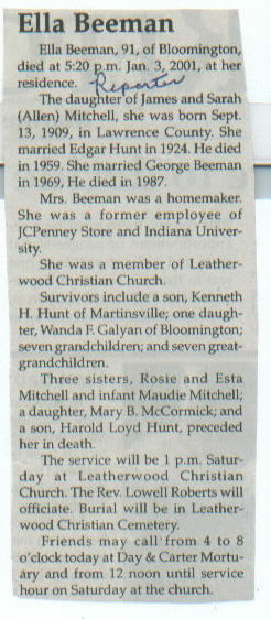 Other Preceded in death by parents, James and Sarah (Allen) Mitchell; both spouses; son, Harold Loyd Hunt; sisters, Rosie and Esta Mitchell; infant, Maudie Mitchell; daughter, Mary B. McCormick.