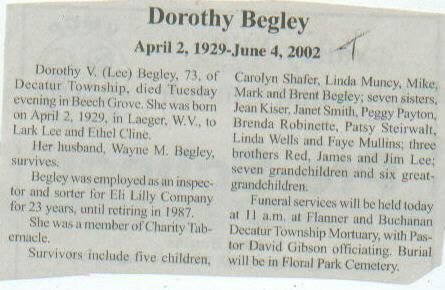 Survived By Spouse; 5 children, Carolyn Shafer, Linda Muncy, Mike, Mark, and Brent Begler; 7 sisters, Jean Kiser, Janet Smith, Peggy Payton, Brenda Robinette, Patsy Steirwalt, Linda Wells, and Faye Mullins; 3 brothers, Red, James, and Jim Lee.