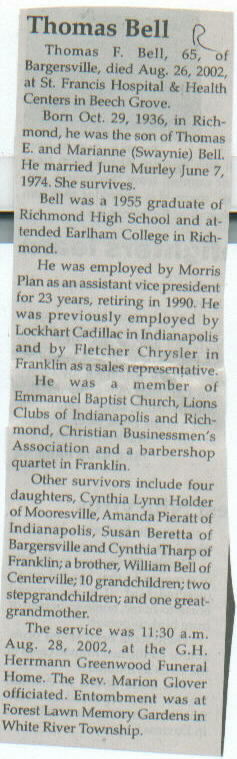 | Survived By | Widow; 4 daughters, Cynthia Lynn Holder, Amanda Pieratt, Susan Beretta, and Cynthia Tharp; brother, William Bell; 10 grandchildren; 2 stepgrandchildren; one great-grandchild. |