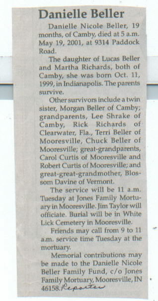 | Survived By | Parents, Lucas Beller and Martha Richards; twin sister, Morgan Beller; grandparents; great-grandparents; great-great-grandmother. |