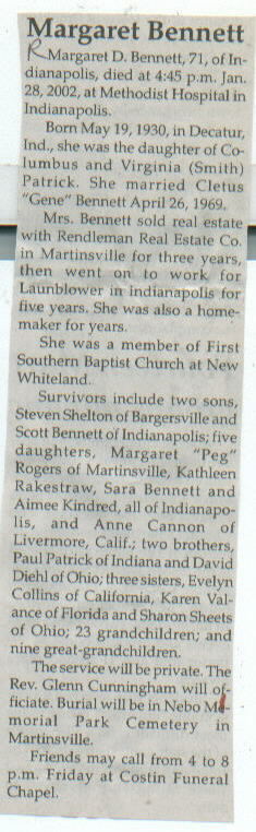 | Survived By | Two sons, Steven Shelton and Scott Bennett; 5 daughters, Margaret "Peg" Rogers, Kathleen Rakestraw, Sara Bennett, Aimee Kindred, and Anne Cannon; 2 brothers, Paul Patrick and David Diehl; sisters, Evelyn Collins and Karen Valance. |