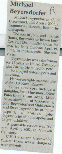 | Survived By | Spouse; daughter, Patty Huesman; 3 sons, Mike, John, and Steve Beyersdorfer; brother, John Beyersdorfer; 14 grandchildren. |