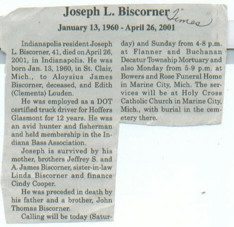 | Other | Age 41. Preceded in death by father, Aloysius James Biscorner; brother, John Thomas Biscorner. |