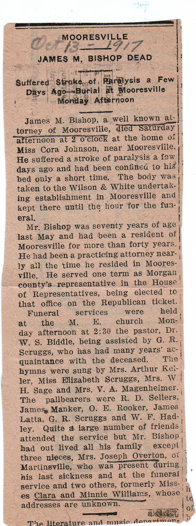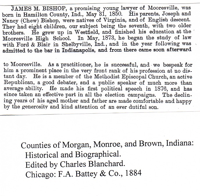 Other Age 70. Parents, Joseph Bishop and Nancy Chew Bishop, both natives of Virginia and of English descent. James M. was the seventh of their eight children. Admitted to the bar in 1874; became a well-respected lawyer in Mooresville. Member M. E. Church. Never married. Died in Mooresville; born in Hamilton Co. [Tombstone gives birth year as 1847.]