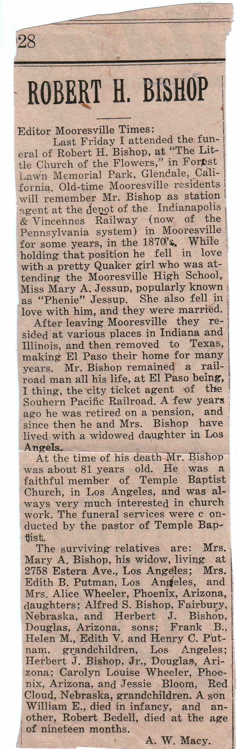 | Survived By | Widow, who resides on Estera Ave, Los Angeles, Calif.; daughters, Mrs. Edith B. Putman and Mrs. Alice Wheeler; sons, Alfred and Herbert H. Bishop; 7 grandchildren. (A son, William E., died in infancy and son Robert Bedell died at age 19 months.) |
