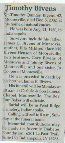 | Survived By | Father, James C. Bivens; mother, Ella Mildred (Jacnick) Bivens Henson; 2 brothers, Gary and Johnny Bivens; sister, Jo Cooper. |