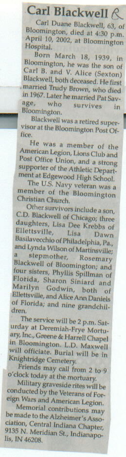 | Survived By | Spouse; son, C. D. Blackwell; 3 daughters, Lisa Dee Krebbs, Lisa Dawn Basilavecchio, and Lynda Wilson; stepmother, Rosemary Blackwell; 4 sisters, Phyllis Spillman, Sharon Siniard, Marilyn Godwin, and Alice Ann Daniels; 9 grandchildren. |