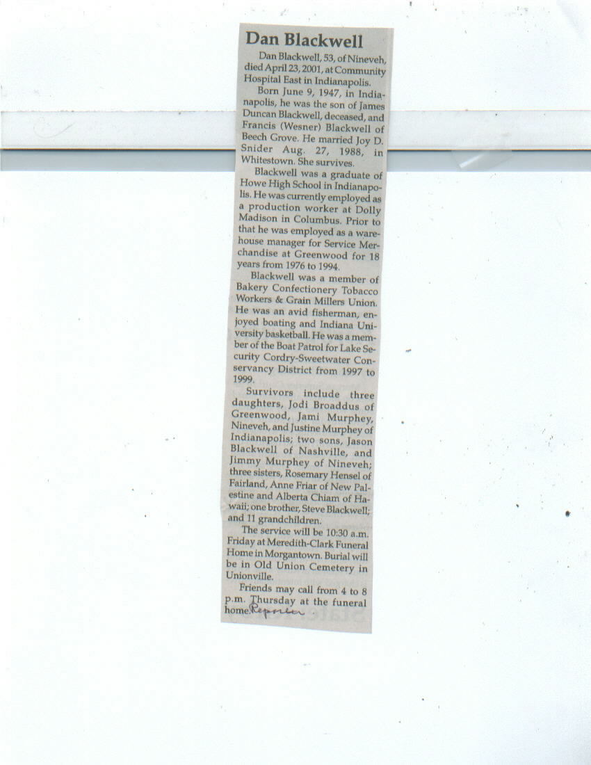 | Survived By | Spouse; daughters, Jodi Broaddus, Jami Murphey, and Justine Murphey; sons, Jason Blackwell and Jimmy Murphey; sisters, Rosemary Hensel, Anne Friar, and Alberta Chiam; brother, Steve Blackwell; 11 grandchildren; mother, Francis (Wesner)Blackwell. |