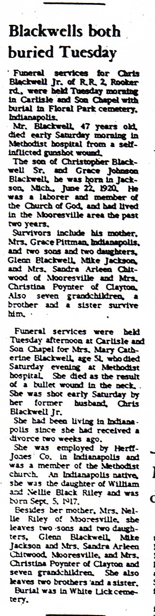 | Other | Age 51. Died of gunshot wound to the neck; shot by former husband Chris Backwell, Jr., from whom she was divorced just two weeks ago. Carlisle Chapel; buried White Lick Cemetery, Oct. 15, 1968. Her parents were William and Nellie Black Riley. |