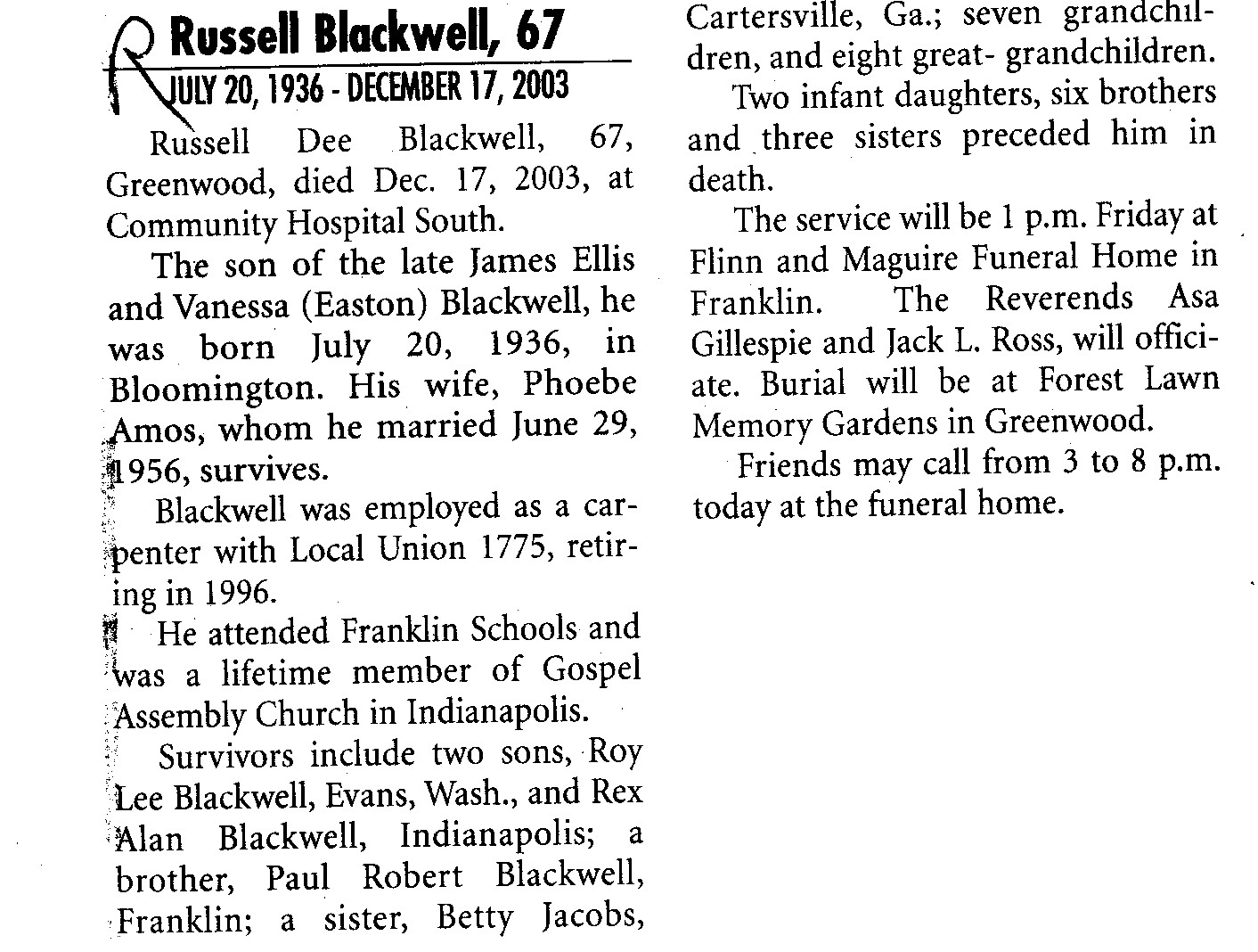 | Survived By | Wife; 2 sons, Roy Lee Blackwell and Rex Alan Blackwell; brother, Paul Robert Blackwell; sister, Betty Jacobs; 7 grandchildren; 8 great-grandchildren. |
