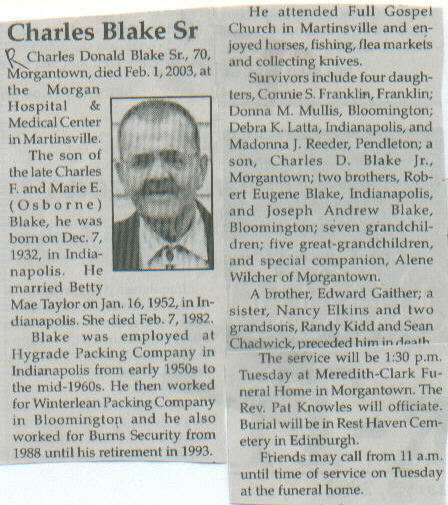 Survived By Four daughters, Connie S. Franklin, Donna M. Mullis, Debra K. Latta, and Madonna J. Reeder; son, Charles D. Blake, Jr.; 2 brothers, Robert Eugene and Joseph Andrew Blake; 7 grandchildren; 5 great-grandchildren; special companion, Alene Wilcher.