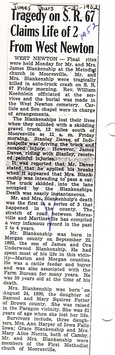 Other Age 61. Daughter of Samuel and Mary Squires Potter of Brown township, Morgan Co., Ind. She was raised in the Paragon vicinity. Married James Blankenship on Nov. 25, 1915. She and her husband died in a tragic auto accident on State Road 67 when their car collided with a skidding gravel truck, 12 miles south of Mooresville. The couple resided in West Newton, and were members of the Mooresville Methodist Church. Carlisle double funeral at Methodist Church (Rev. Wm. Koehnlein.) Buried West Newton cemetery.
