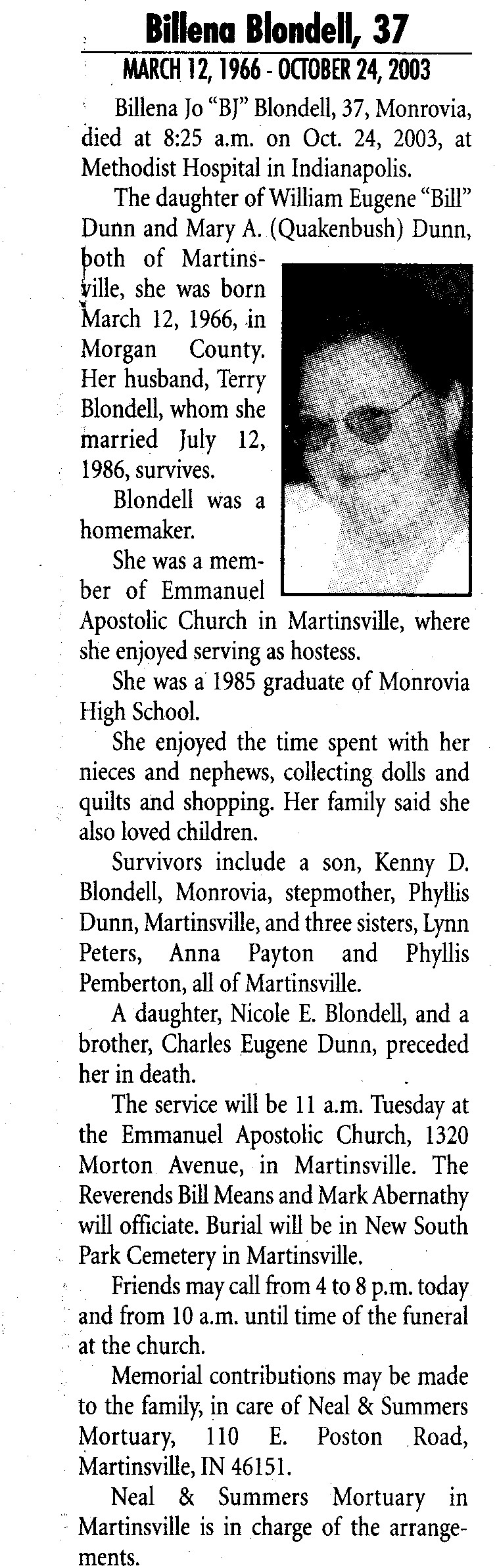 | Survived By | Husband; son, Kenny D. Blondell; stepmother, Phyllis Dunn; 3 sisters, Lynn Peters, Anna Payton, and Phyllis Pemberton. |