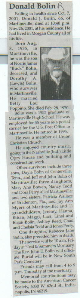 | Survived By | Mother, Dorothy A.(Lewis) Bolin; sons, Doyle, Jeff, and John Bolin; daughters, Mary Ann Bowen, Nancy Todd, and Dora Perry; sisters, Patricia Wallace and Joy Ann Myers; 11 grandchildren. |