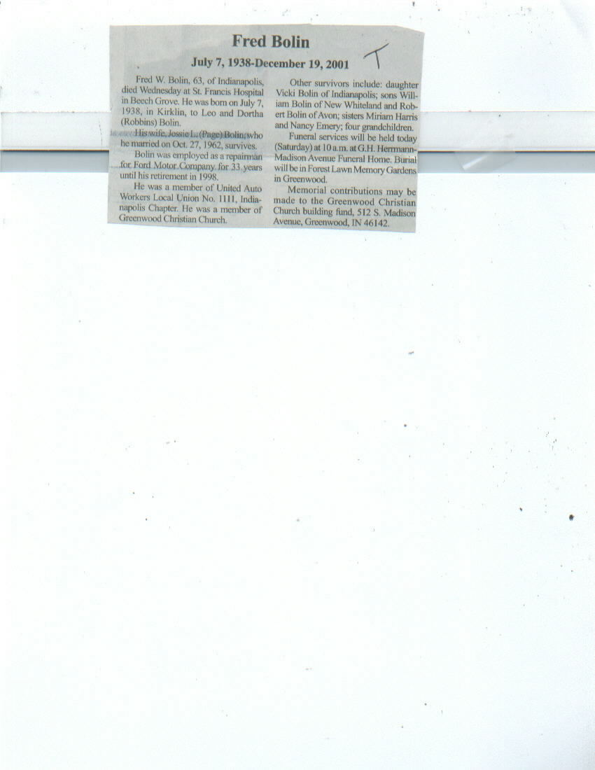 Survived By Spouse; daughter, Vicki Bolin; sons, William and Robert Bolin; sisters, Miriam Harris and Nancy Emery; 4 grandchildren.