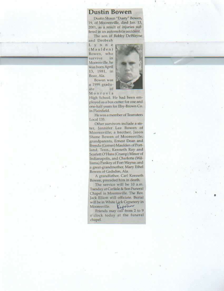 | Survived By | Parents, Bobby DeWayne and Deborah Lynne (Maulden) Bowen; sister, Jennifer Lee Bowen; brother, Jason Shane Bowen; grandparents; one great-grandmother. |