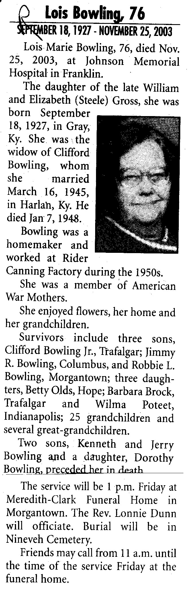 | Survived By | Three sons, Clifford Bowling, Jr., Jimmie R. Bowling, and Robbie L. Bowling; 3 daughters, Betty Olds, Barbara Brock, and Wilma Poteet; 25 grandchildren; several great-grandchildren. |