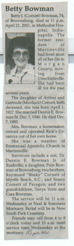 | Survived By | Son, Dr. Dennis E. Bowman, Jr.; daughter, Pam Bowman; brothers, Raymond and Sonny Cornett; 2 grandchildren. |