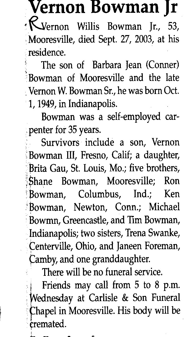 | Survived By | Son, Vernon Bowman III; daughter, Brita Gau; 5 brothers, Shane, Ron, Ken, Michael, and Tim Bowman; 2 sisters, Trena Swanke and Janeen Foreman; granddaughter. |