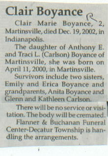 | Survived By | Parents, Anthony E. and Traci L. (Carlson) Boyance; 2 sisters, Emily and Erica Boyance; grandparents, Anita Boyance, and Glenn and Kathleen Carlson. |