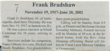 Survived By Companion, Fanny Gibson; 2 sons, Michael and Randy Bradshaw; 5 grandchildren; 3 great-grandchildren.