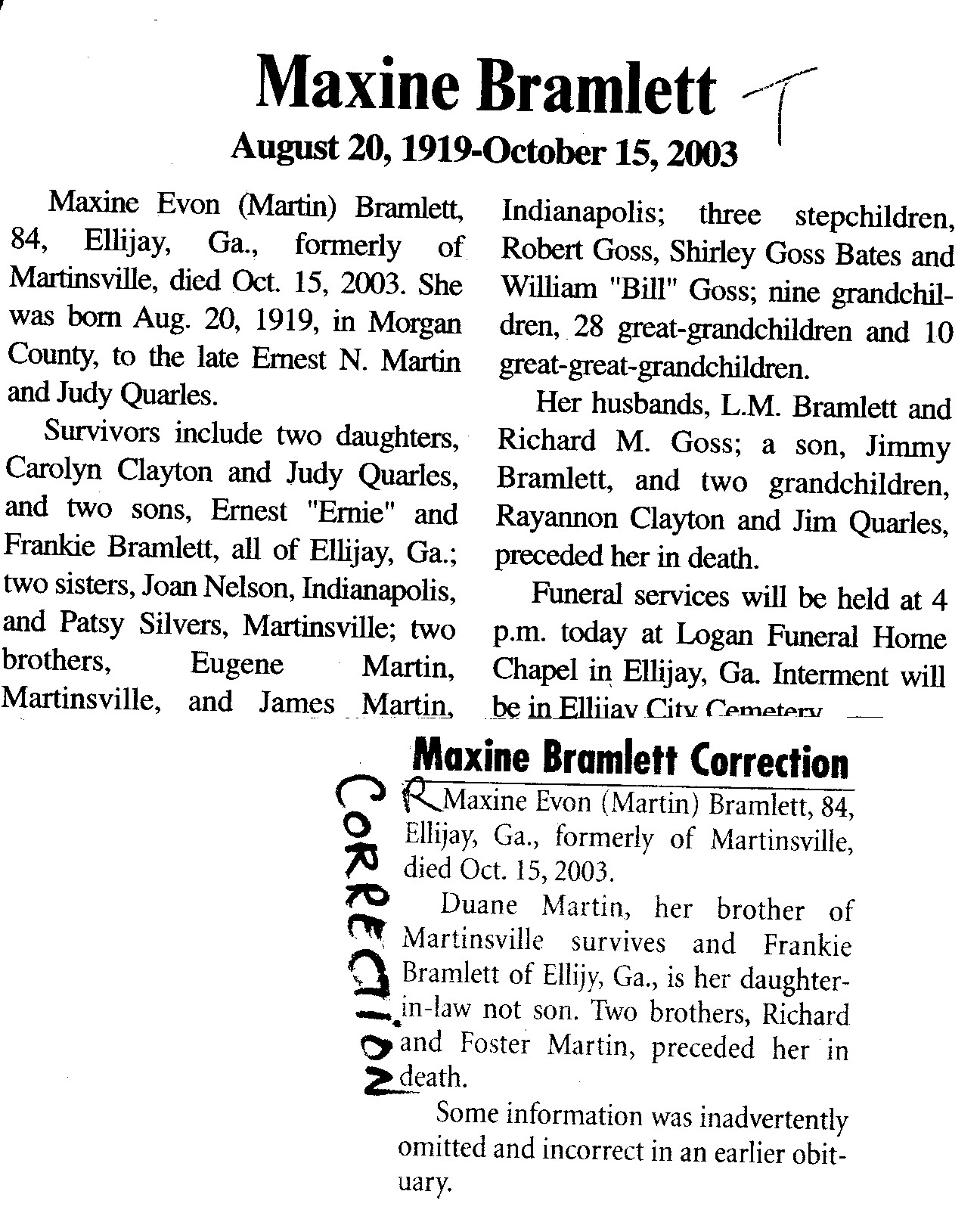 Survived By Two daughters, Carolyn Clayton and Judy Quarles; son, Ernest "Ernie" Bramlett; 2 sisters, Joan Nelson and Patsy Silvers; 3 brothers, Eugene, James, and Duane Martin; 3 stepchildren, Robert Goss, Shirley Goss Bates, and William "Bill" Goss; 9 grandchildren; 28 great-grandchildren; 10 great-great-grandchildren.