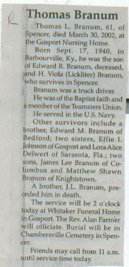 Survived By Mother, H. Viola (Lickliter) Branum; brother, Edward M. Branum; 2 sisters, Effie I. Johnson and Lora Alice Deiwert; 2 sons, James Lee and Matthew Shawn Branum.