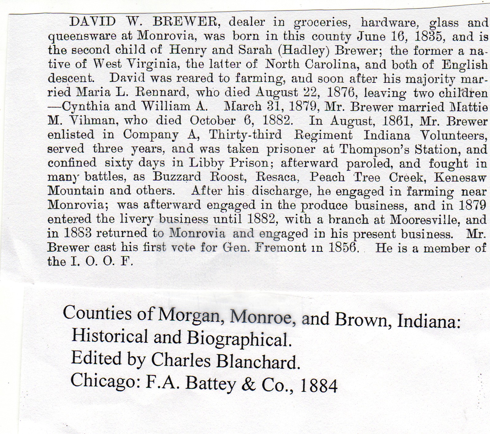 | Other | Age 70. Born in Morgan Co., Ind. Parents: Henry and Sarah (Hadley) Brewer. Father of 2 children from his first marriage. First wife died in 1877; second wife died in 1882. Quaker and Civil War veteran: Sgt., Co. A, 33rd Reg. Ind. Vol. Died in Indianapolis at the home of his daughter, Mrs. Charles [Cyntha] Wellman. "He was one of Monroe Township's most respected citizens." |