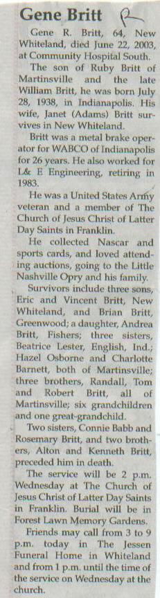 | Survived By | Widow; 3 sons, Eric, Vincent, and Brian Britt; daughter, Andrea Britt; 3 sisters, Beatrice Lester, Hazel Osborne, and Charlotte Barnett; 3 brothers, Randall, Tom, and Robert Britt; 6 grandchildren; one great-grandchild. |