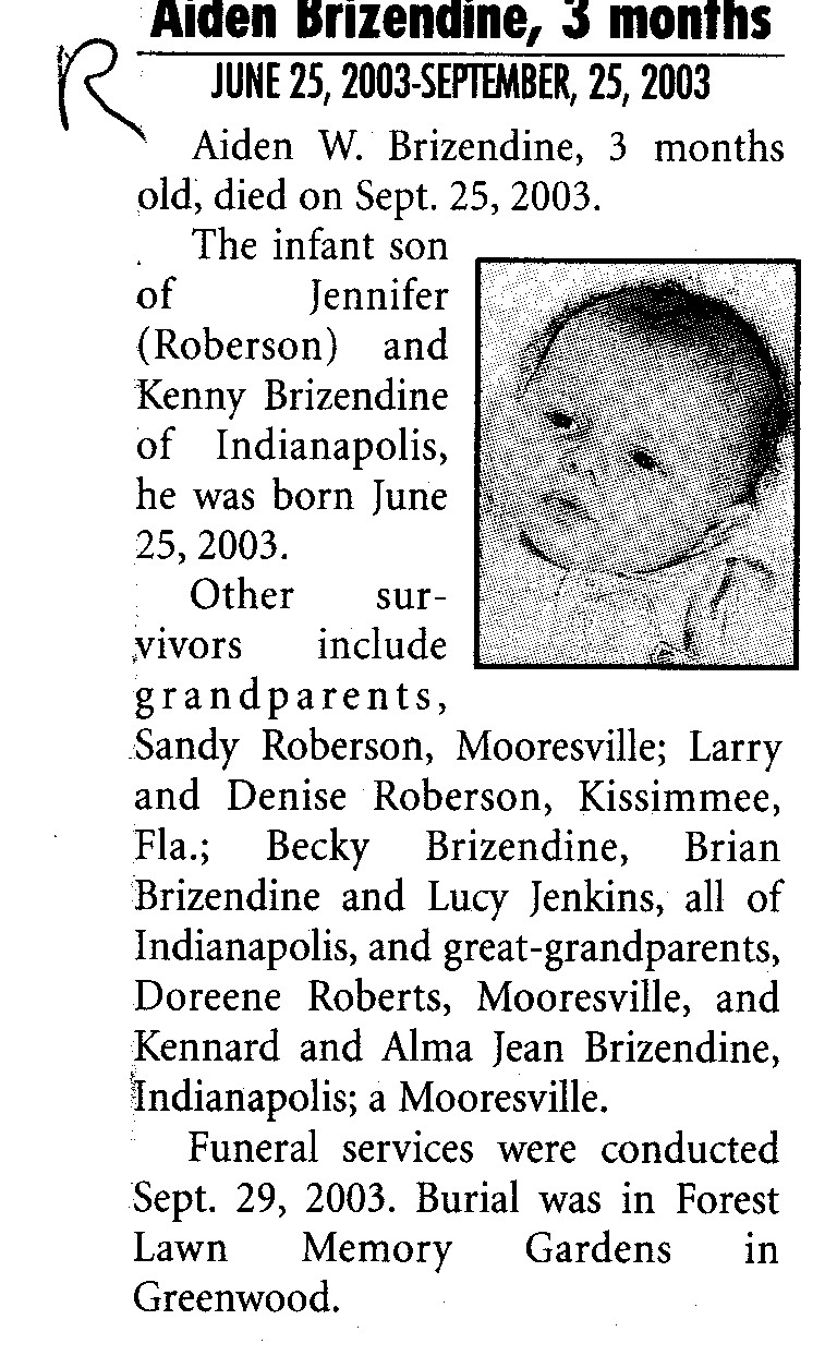 | Survived By | Parents, Jennifer (Roberson) and Kenny Brizendine; grandparents, Sandy Roberson, Larry and Denise Roberson, Becky Brizendine, Brian Brizendine, and Lucy Jenkins; great-grandparents, Doreene Roberts, and Kennard and Alma Jean Brizendine. |