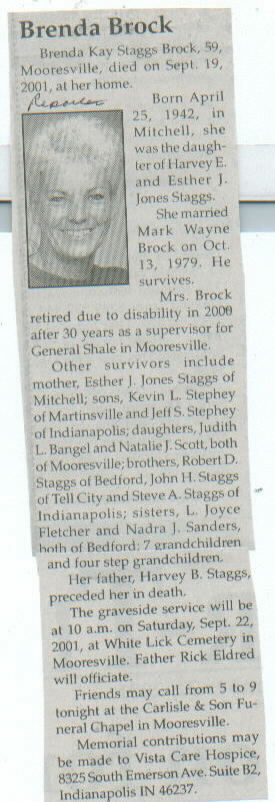 | Survived By | Spouse; mother, Esther J. Jones Staggs; sons, Kevin L. and Jeff S. Stephey; daughters, Judith L. Bangel and Natalie J. Scott; brothers, Robert D., John H., and Steve A. Staggs; sisters, L. Joyce Fletcher and Nadra J. Sanders; 7 grandchildren; 4 stepgrandchildren. |