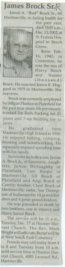 | Survived By | Widow; son, James A. Brock, Jr.; daughters, JoAnn Willoughby, Lori Burpo, Jill Brock, and Angi Brock; brother, Chad Brock; sister, Sue Thompson; 14 grandchildren; 4 great-grandchildren. |