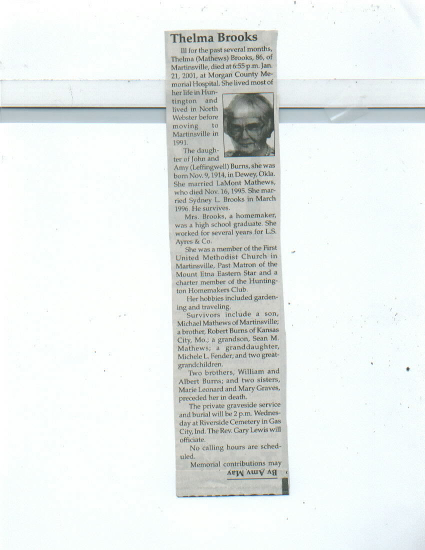 | Other | Preceded in death by parents, John and Amy (Leffingwell) Burns; 1st husband, LaMont Mathews; brothers, Wiliam and Albert Burns; sisters, Marie Leonard and Mary Graves. |