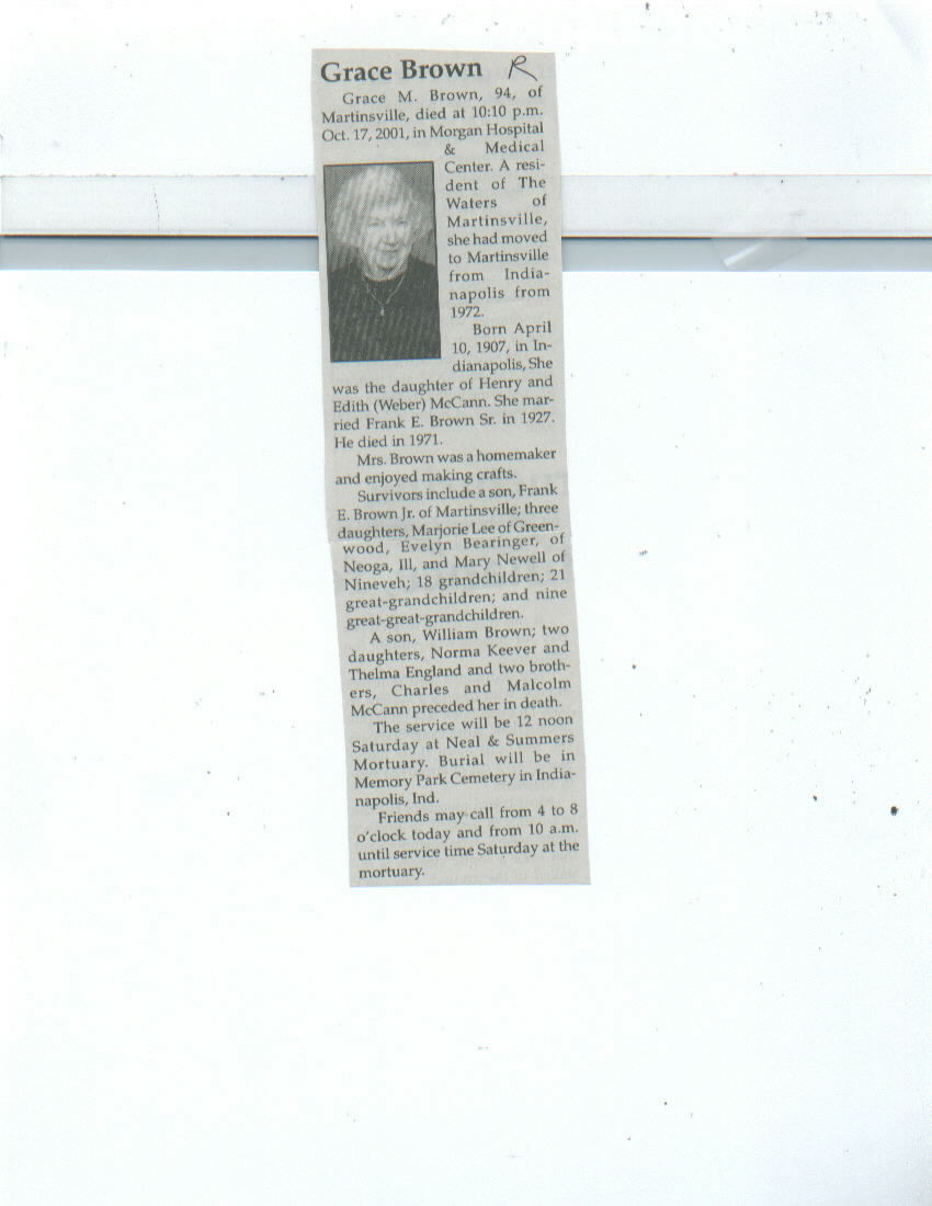 Other Preceded in death by husband; parents, Henry and Edith (Weber) McCann; son, William Brown; daughters, Norma Keever and Thelma England; brothers, Charles and Malcolm McCann.