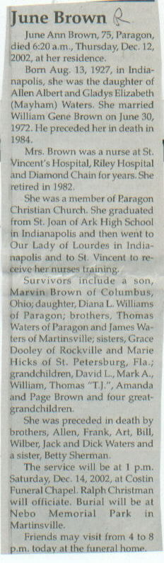 | Survived By | Son, Marvin Brown; daughter, Diana L. Williams; brothers, Thomas and James Waters; sisters, Grace Dooley and Marie Hicks; grandchildren, David L., Mark A., William, Thomas "T. J.", Amanda, and Page Brown; 4 great-grandchildren. |