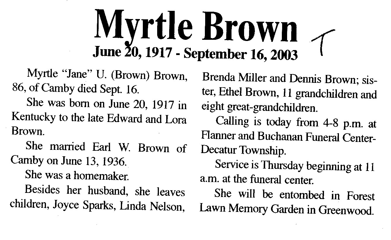 | Survived By | Husband; son, Dennis Brown; 3 daughters, Joyce Sparks, Linda Nelson, and Brenda Miller; sister, Ethel Brown; 11 grandchildren; 8 great-grandchildren. |