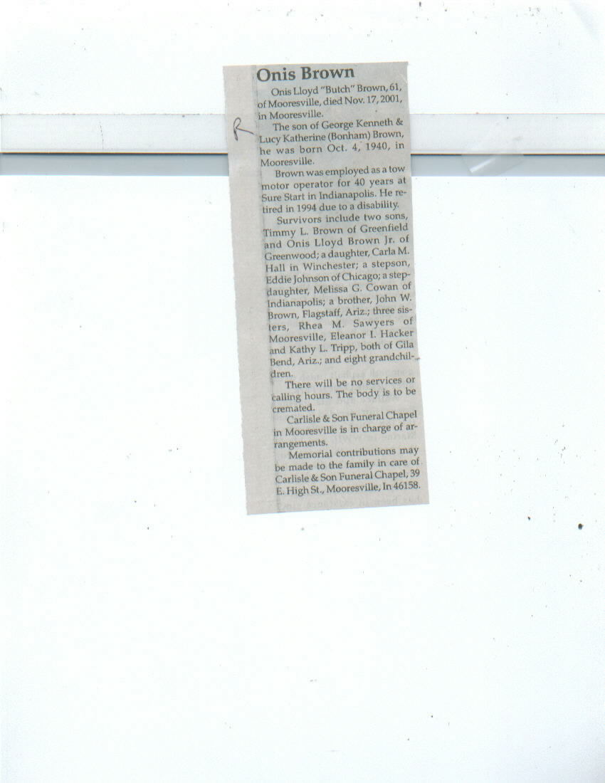 | Survived By | Sons, Timmy L. Brown and Onis Lloyd Brown, Jr.; daughter, Carla M. Hall; stepson, Eddie Johnson; stepdaughter, Melissa G. Cowan; brother, John W. Brown; sisters, Rhea M. Sawyers, Eleanor I. Hacker, and Kathy L. Tripp; 8 grandchildren. |