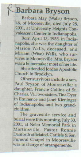 Survived By Mother, Miriam (Wise); Walls; son, Paul Bryson; daughter, Francie Collins; sisters, Tina Dyer and Janet Kieninger; 2 grandchildren.