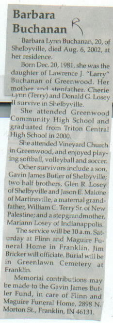 | Survived By | Father, Lawrence J. "Larry" Buchanan; mother and stepfather, Cherie Lynn (Terry) and Donald G. Losey II; son, Gavin James Butler; 2 half brothers, Glen R. Losey and Jason E. Malone; maternal grandfather, William C. Terry, Sr. |