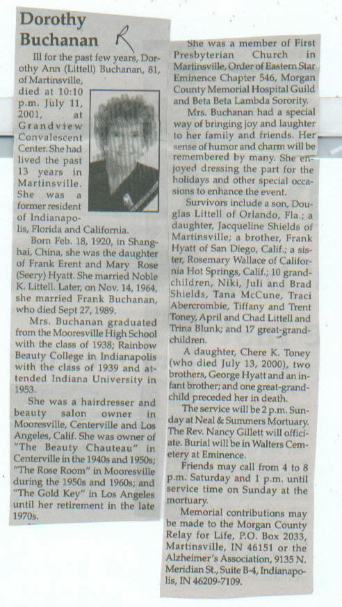 | Survived By | Son, Douglas Littell; daughter, Jacqueline Shields; brother, Frank Hyatt; sister, Rosemary Wallace; 10 grandchildren; 7 great-grandchildren. |