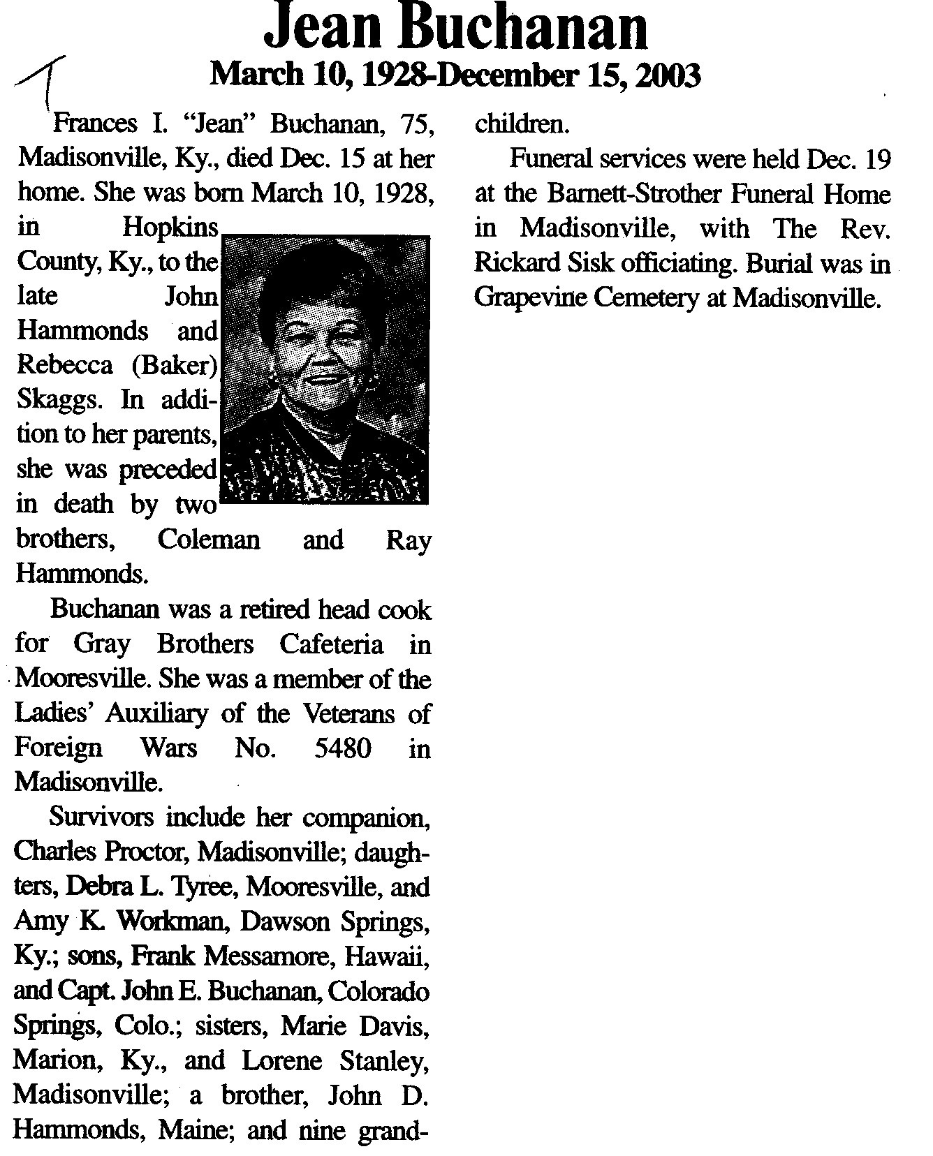 Survived By Companion, Charles Proctor; 2 daughters, Debra L. Tyree and Amy K. Workman; 2 sons, Frank Messamore and Capt. John E. Buchanan; 2 sisters, Marie Davis and Lorene Stanley; brother, John D. Hammonds; 9 grandchildren.