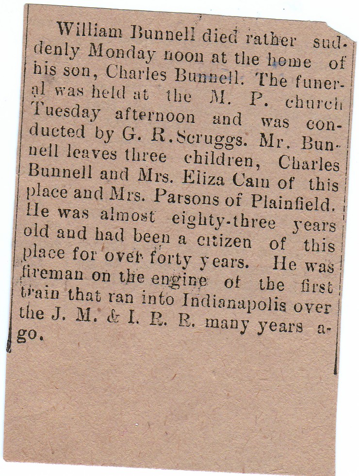 | Other | Age 82. "...one of Mooresville's oldest citizens, died Monday at the home of his son, Charles Bunnell, who he has been living with since the death of his wife, a few years ago. He came to Mooresville in 1847." |