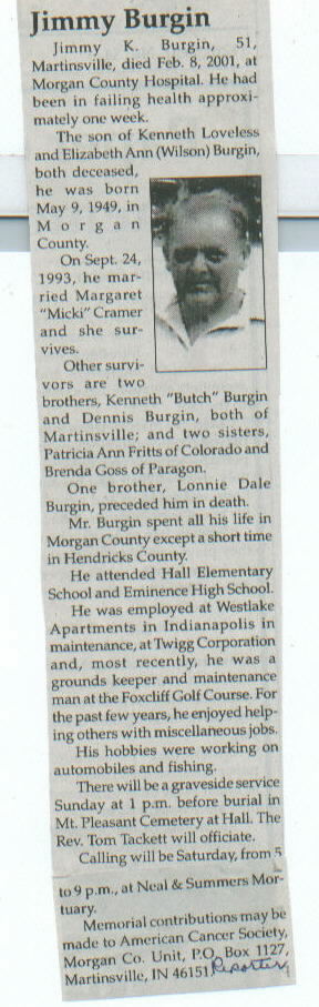 Other Preceded in death by parents, Kenneth Loveless and Elizabeth Ann (Wilson) Burgin; brother, Lonnie Dale Burgin.