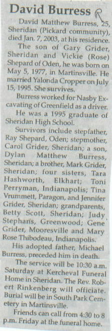 Survived By Widow; parents, Gary Grider and Vickie (Rose) Shepard; stepfather, Ray Shepard; stepmother, Carol Grider; son, Dylan Matthew Burress; brother, Mark Grider; 4 sisters, Tara Hashworth, Toni Perryman, Tina Vrummett, and Jennifer Grider; grandparents, Betty Scott, Judy Stephans, Gene Grider, and Mary Rose Thibodeau.