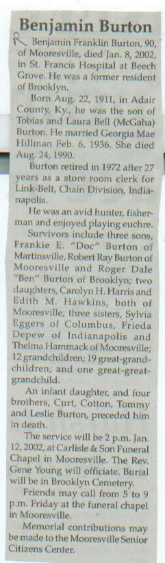 | Survived By | Three sons, Frankie E. "Doc", Robert Ray, and Roger Dale "Ben" Burton; 2 daughters, Carolyn H. Harris and Edith M. Hawkins; 3 sisters, Sylvia Eggers, Frieda Depew, and Thelma Hammack; 12 grandchildren; 19 great-grandchildren. |